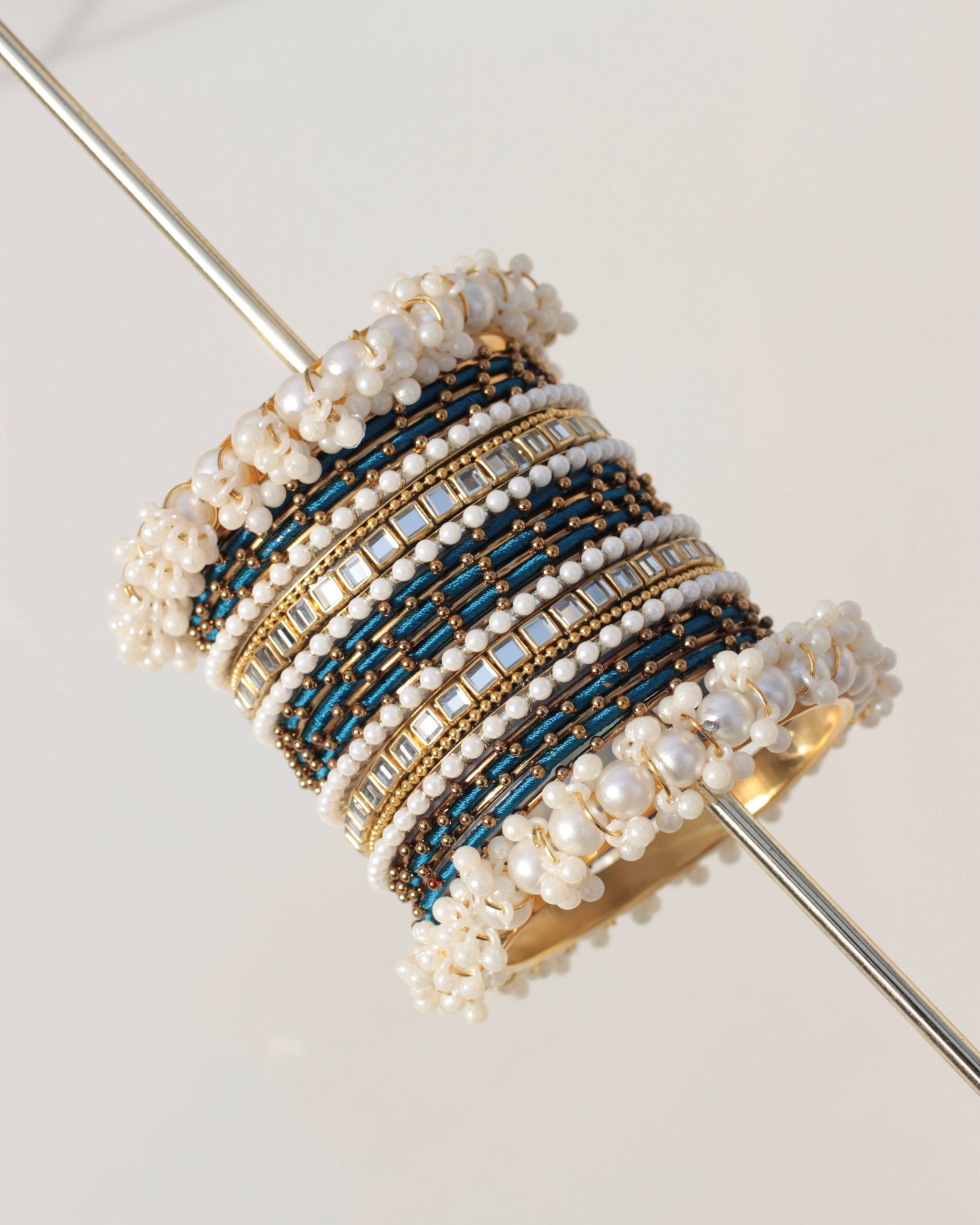 This Eid, adorn your hands with grace and tradition with our exquisite collection of handcrafted bangles. Designed for the festive season, our bangles blend luxury and heritage, featuring velvet textures, lustrous pearls, and intricate Kundan embellishments. Whether you're dressing up for family gatherings or grand celebrations, these bangles add the perfect finishing touch to your Eid ensemble.